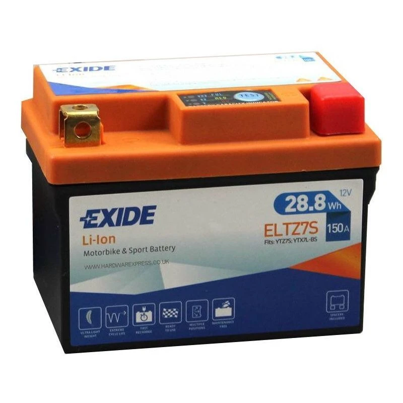 De Exide ELTZ7S motoraccu heeft een spanning van 12V, een capaciteit (20h) van 2.4 Ah en een startcapaciteit van 150 A (CCA). De afmetingen zijn 113 mm lang, bij 70 mm breed en 85 mm hoog.